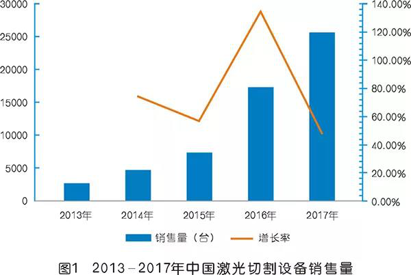 2010年之前,由于激光切割設(shè)備價(jià)格高昂,一臺大幅面激光切割機(jī)(配備4 kW激光器)售價(jià)近600萬元人民幣,國內(nèi)采用大幅面激光切割機(jī)的企業(yè)并不多。2011年以后,國內(nèi)激光企業(yè)大力發(fā)展大功率光纖激光切割機(jī),由于大功率光纖激光加工具有獨(dú)特的加工優(yōu)勢,加工成本大幅下降,同時(shí)結(jié)合多種靈活的付款方式,目前越來越多的鈑金加工企業(yè)、廚衛(wèi)制造企業(yè)以及汽車部件加工企業(yè)使用激光切割機(jī)。最近幾年激光加工設(shè)備得以快速普及,2017年我國激光切割成套設(shè)備銷售量超過2.5萬臺。(見圖1)