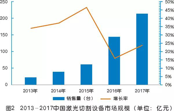 2017年全球激光加工設(shè)備市場規(guī)模為313.7億美元,同比增長12%。2017年中國激光設(shè)備市場銷售總規(guī)模超過442億元,激光切割設(shè)備占全國工業(yè)激光加工設(shè)備市場規(guī)模的46%。其中中小功率激光切割設(shè)備市場銷售規(guī)模一直保持較高的增長速度,其核心激光器實(shí)現(xiàn)了較高的國產(chǎn)化率。(見圖2)